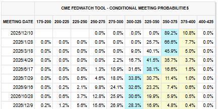 这份ADP报告是美联储在12月利率决议前获得的最后一份就业数据。11月ADP就业数据远不及预期,强化了市场对美联储将进一步降息的预期。这为市场中主张降息的“鸽派”提供了新的弹药。尽管部分官员对是否需要进一步宽松存在疑虑,但期货交易员仍认为美联储有近90%概率将关键利率再下调25个基点。