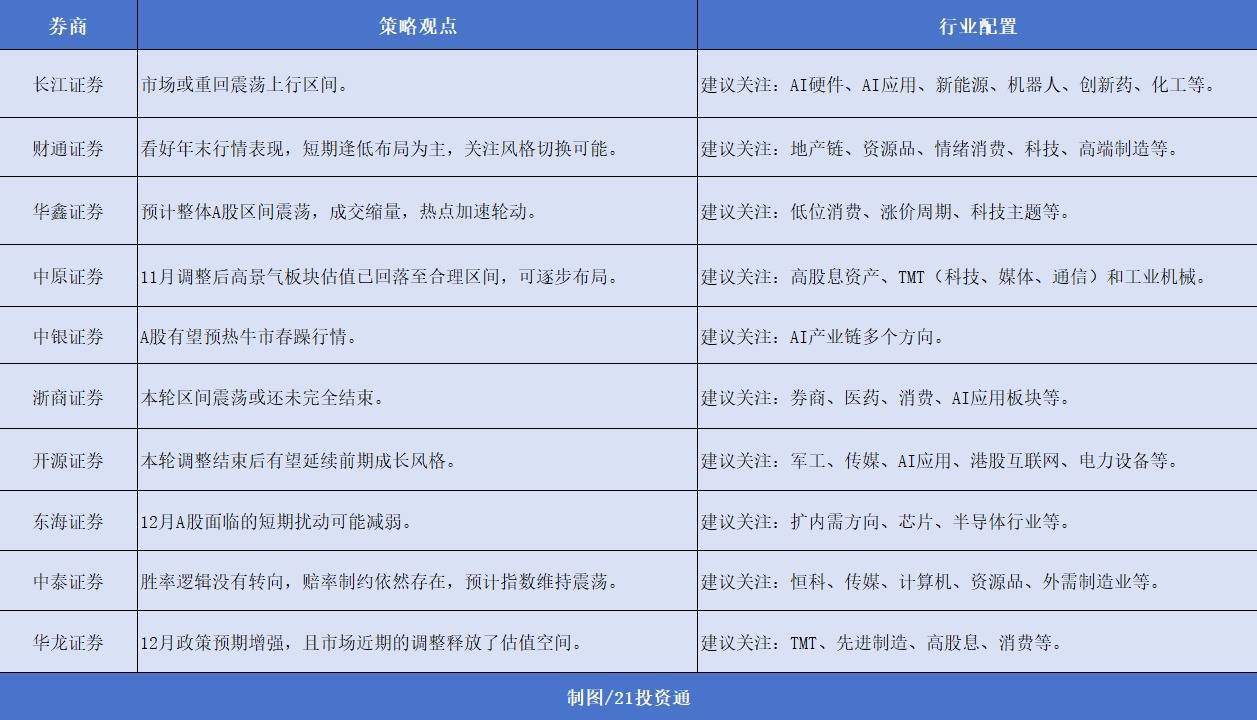 在行业配置方面,在11月A股高位集体调整之后,多家机构科技板块的拥挤度已进一步改善,建议关注科技内部的低位板块,如传媒/游戏、AI应用、军工等。此外,在海外降息和财政扩张的背景下,全球定价资源品(黄金、白银、铜等)也获多家机构推荐。